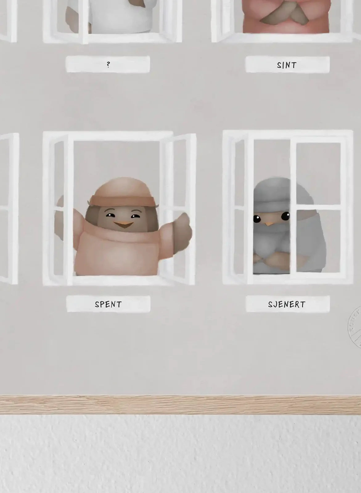 Plakaten viser mange følelser som barn lett kan kjenne seg igjen i. Se på den sammen, og snakk om det dere ser: Hvilke følelser har besøkt deg i dag? Hvor i kroppen kjente du dem? Våre fine små illustrasjoner åpner døren til følelsenes verden.