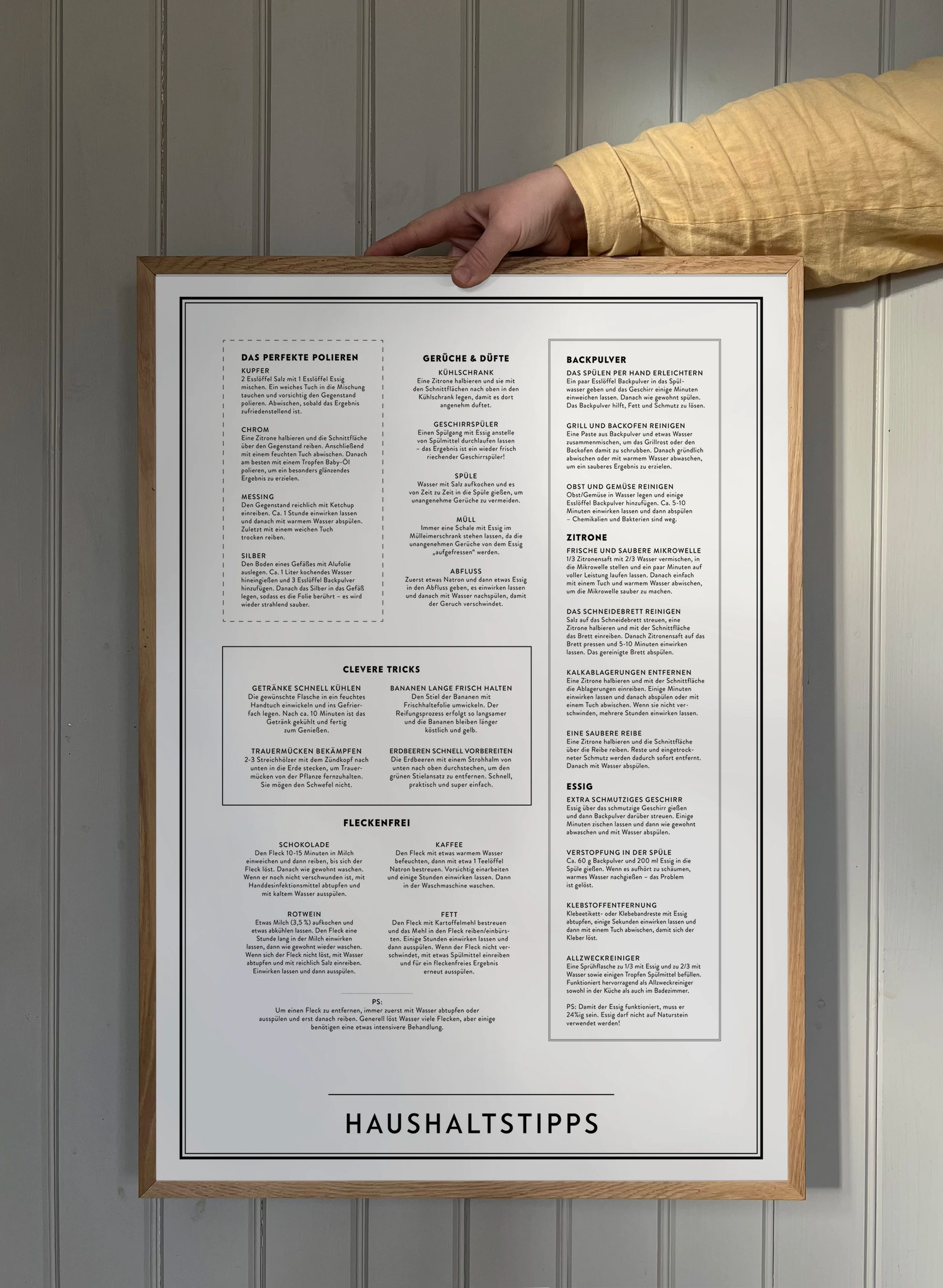All the top household tips you need to know in one easily accessible place. Forget the chemicals and use items you are already likely have in the house! Some of grandma's favourite tips including stain removal, how to make an all purpose cleaner and how to get rid of odours. Perfect! Educational and stylish print, great to hang in the kitchen.