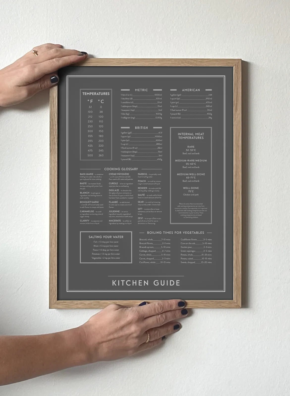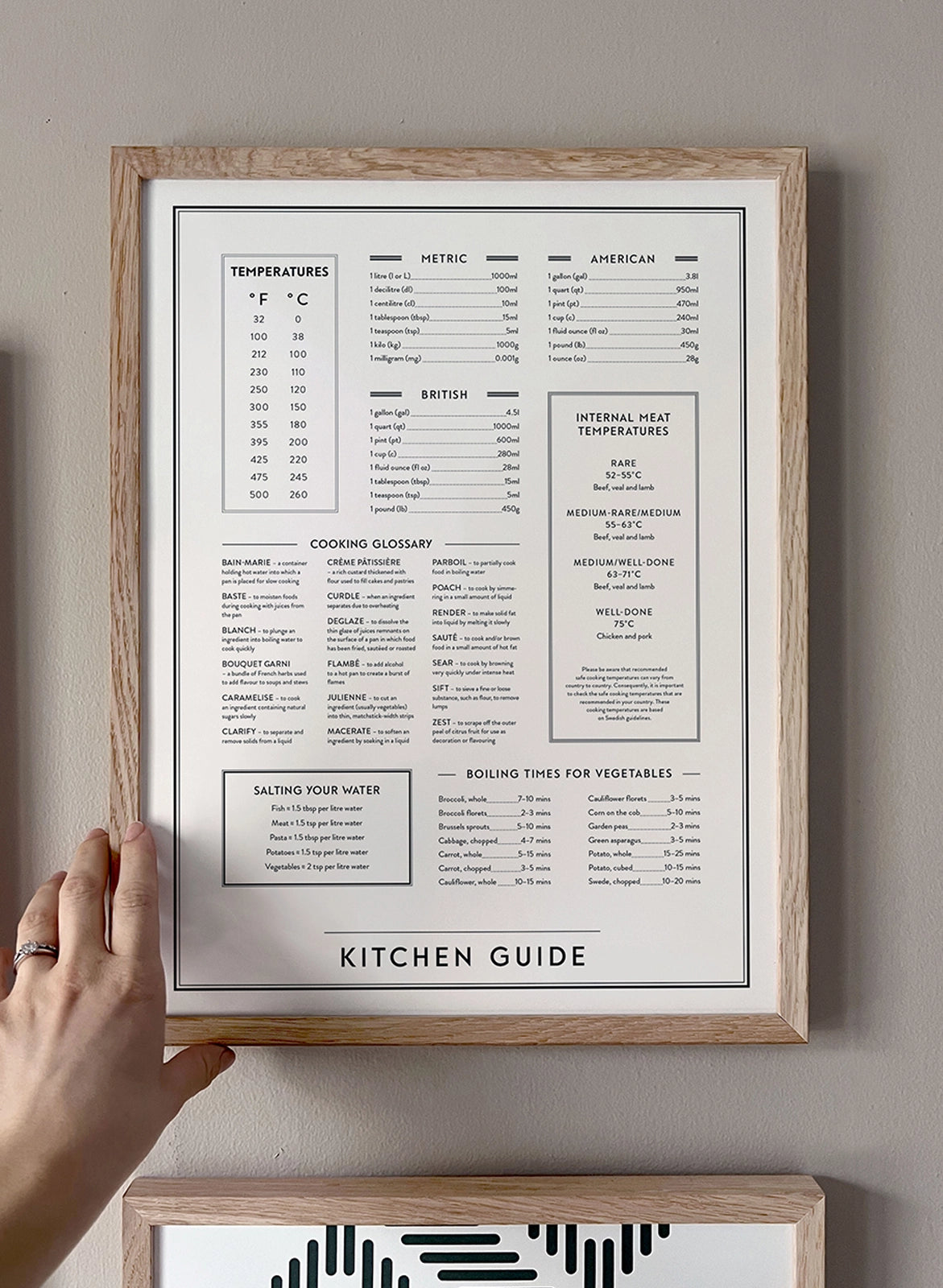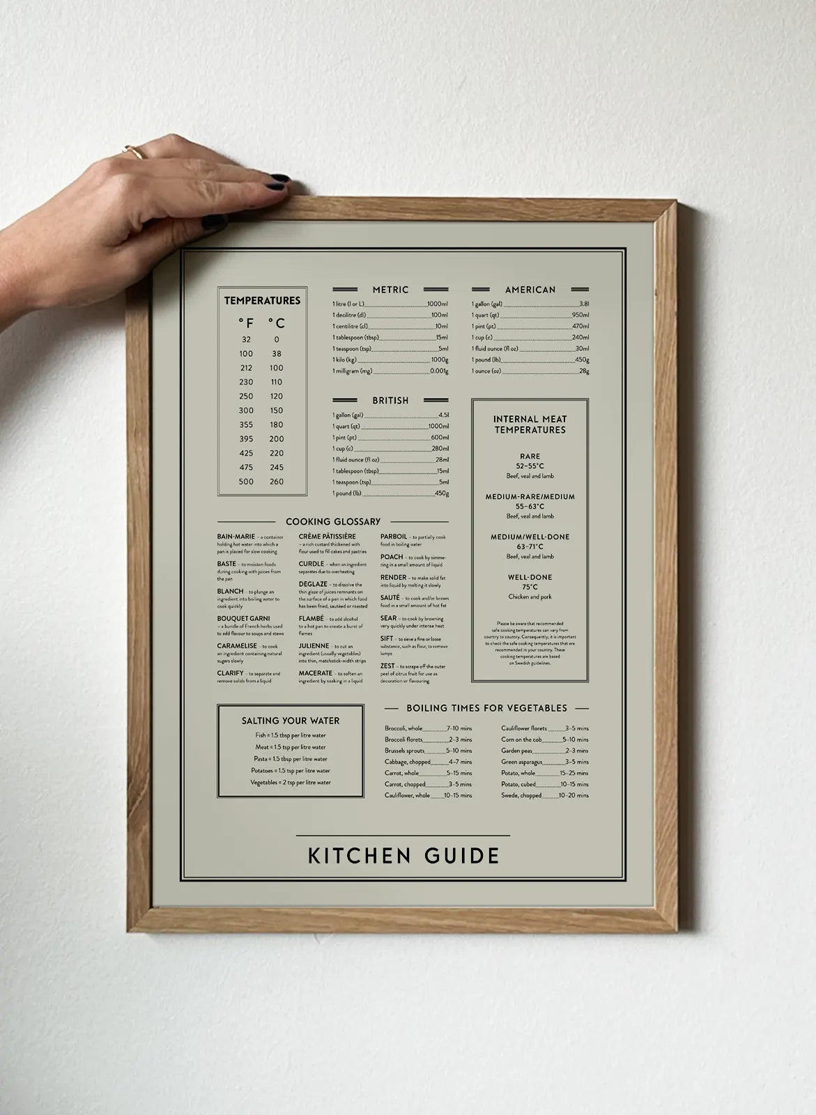 All of the vital cooking tips you need in the kitchen portrayed on a black and white kitchen poster. From metric measurements to ideal boiling times for vegetables –this wall art has it all. This makes a lovely addition to the kitchen as it is not only very knowledgable but also very stylish. All the cooking tips for you in the kitchen on one print.