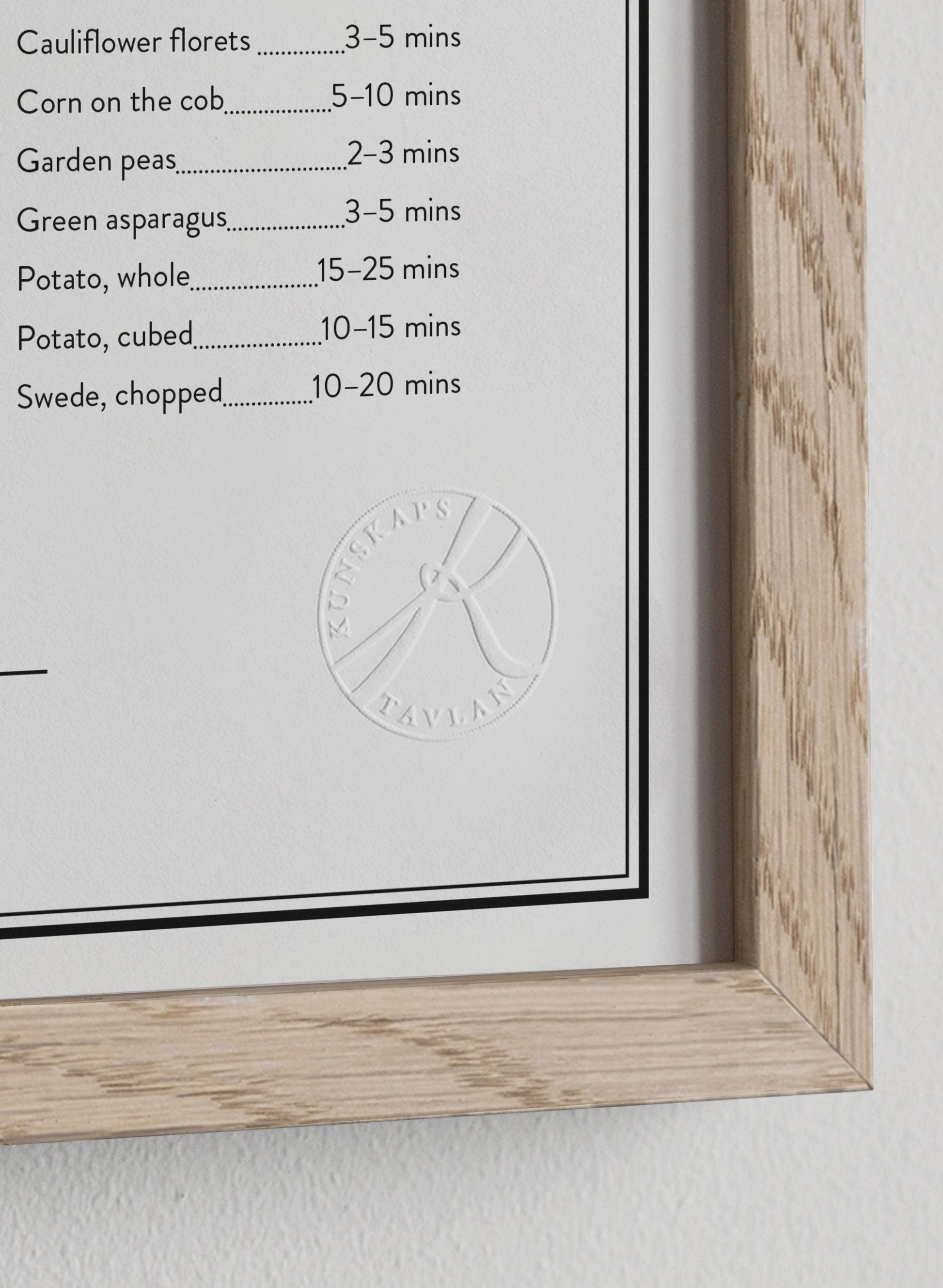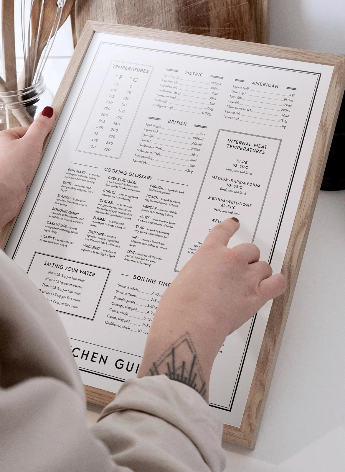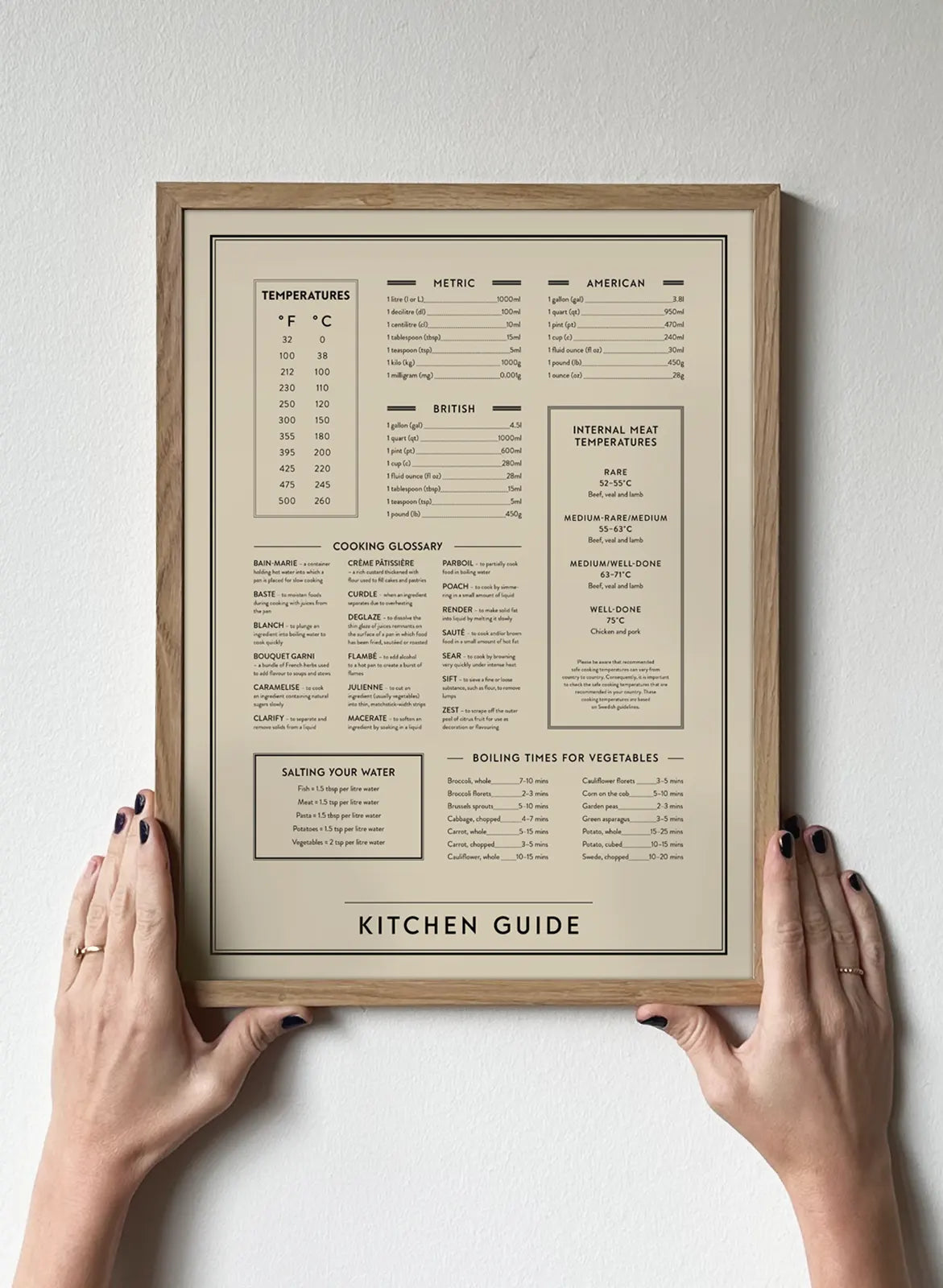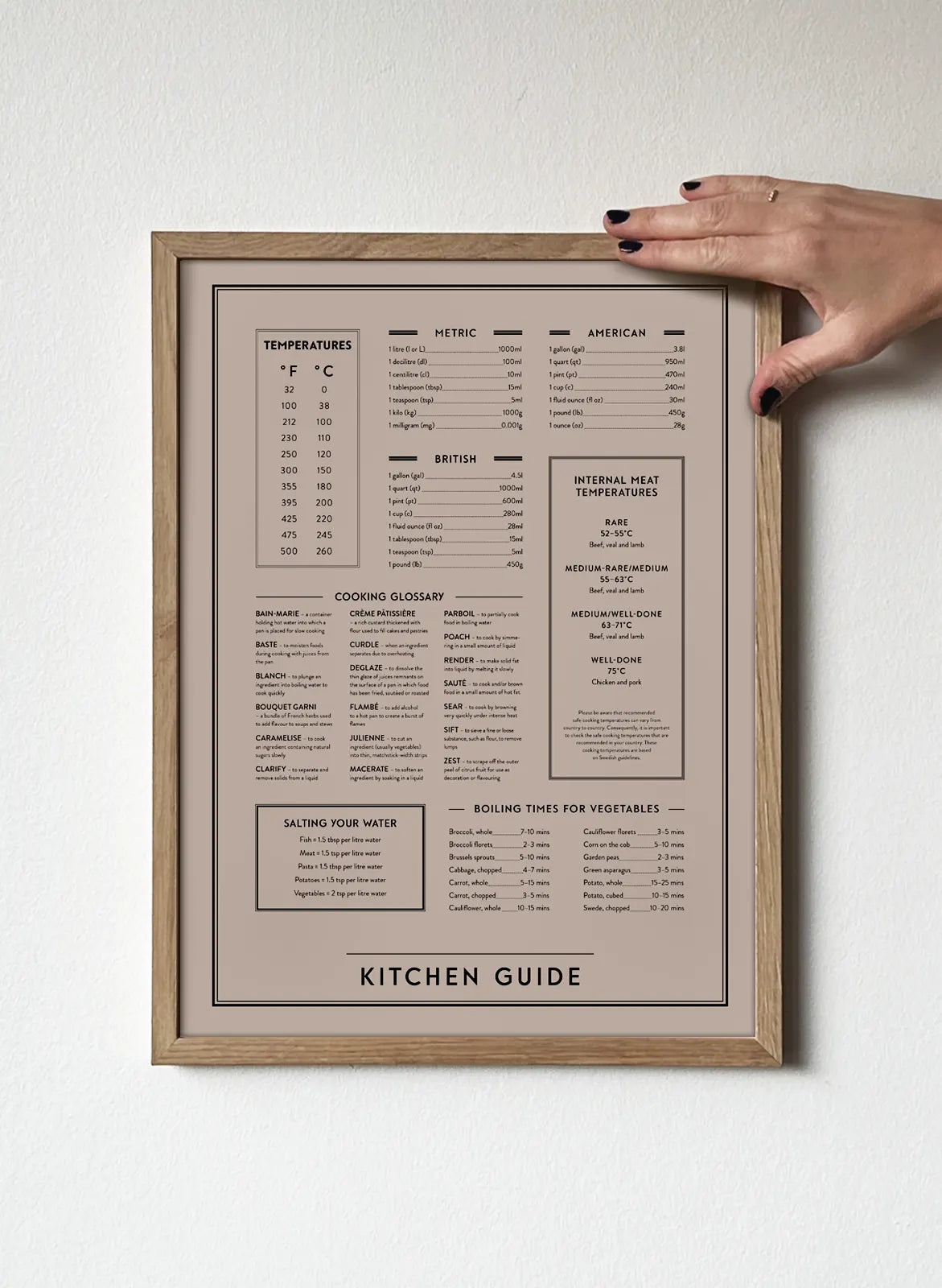 All of the vital cooking tips you need in the kitchen portrayed on a black and white kitchen poster. From metric measurements to ideal boiling times for vegetables –this wall art has it all. This makes a lovely addition to the kitchen as it is not only very knowledgable but also very stylish. All the cooking tips for you in the kitchen on one print.